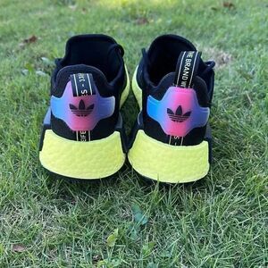 Men’s Adidas NMD R1 Core Black Pulse Yellow Blue Boost Shoes. Iridescent. Please see photos for indications of use.