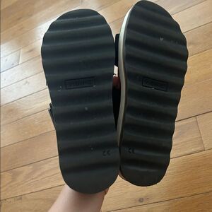 Black straps with tan and white soles