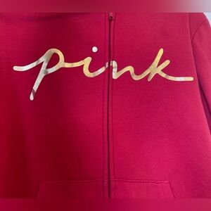 Cozy red zip up hoodie sweatshirt from PINK Victoria's Secret. Very cute gold foil logo across the front at the chest. Even the zipper has the dog logo. Some minor pilling and discoloration at the left wrist area. Not noticeable at all. Still in great condition.