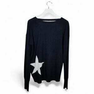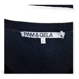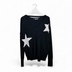 PAM & GELA Star Intarsia Cloud & Black Wool & Cashmere Blend Knit Sweater. 50% wool / 10% nylon / 5% cashmere. Front accent neckline accent. Revolve sweater, high/low hem, contrast star details.