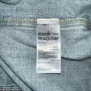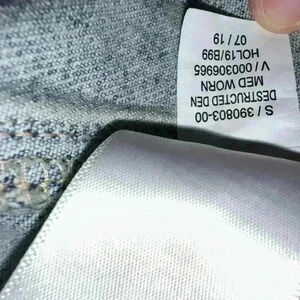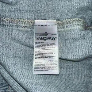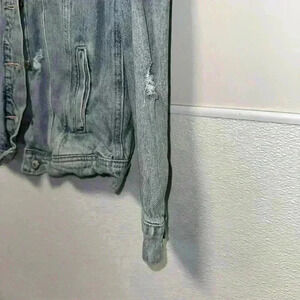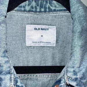 This is a pre-owned Old Navy denim jacket in size M. It is made of a light blue denim fabric and features a classic jean jacket design with a button-up front, two chest pockets, two front pockets, and long sleeves. The jacket has distressed detailing with several small holes and tears throughout. The jacket is in good condition with no major flaws or stains. The tag indicates it was made in Bangladesh.