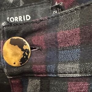 These fun stretch capris have a trendy plaid pattern, full zip pockets and ankle zip. 46 inch stretch waist, 23 inch inseam and 10.5 inch rise. Some of the gold hardware is turning gold, which adds a unique look . Ladies 22. SW.