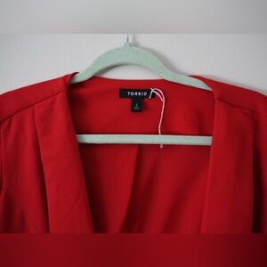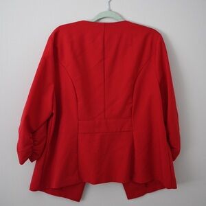Torrid size 2 (18/20) red open-front blazer with ruched (cinched) 3/4 sleeves. It’s an open fit style and it’s made of 75% Polyester, 17% Rayon & 2% Spandex giving it an incredibly flattering and comfortable fit.