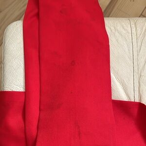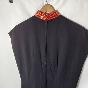 Pre owned dress very good condition. The Asian style dress is lined, no sleeves, has a red belt, the zipper works and there are slits at the bottom sides of the dress. The inside of the belt has a small discoloration. See picture.
