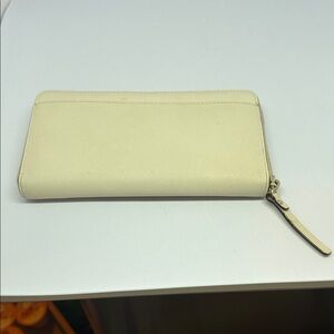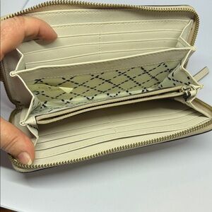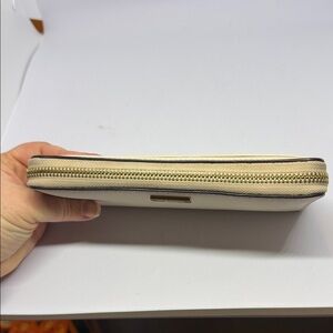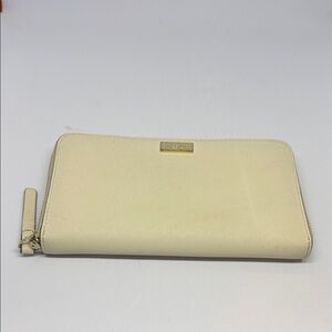 Chic cream wallet with zip-around closure. Sleek and functional design.