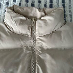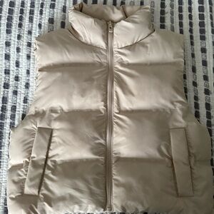 Stylish cream puffer vest. Features a front zipper and pockets. Perfect for layering.