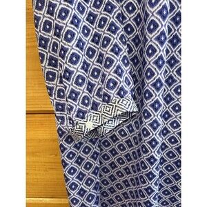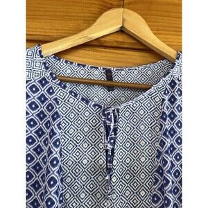 This NYDJ Peasant Blouse in size 1X features a blue and white boho floral pattern with a round neck and tie closure. Made of lightweight polyester, this blouse has a casual sleeve style with a keyhole neck and bow accents. Suitable for travel, casual, and workwear occasions, it embodies a mixed print, bohemian, and peasant theme. Perfect for winter, summer, fall, and spring seasons.
