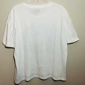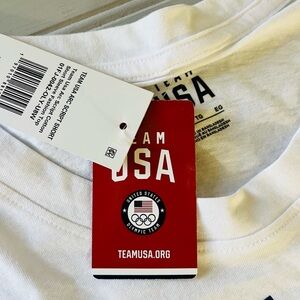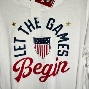 Show your patriotic spirit with this white T-shirt. Featuring a bold 'Let the Games Begin' design, it's perfect for any casual occasion. Brand new with tags, never worn, Team USA, Olympics, Womens Size XL, Let the Games Begin, short cuffed sleeves, crewneck, soft, lightweight, relaxed fit, please see pictures for approximate measurements, 60% Cotton, 40% Polyester, machine washable, Olympics fan gear, collectible Olympics, Team USA, Patriotic, graphic t-shirt, casual, athleisure