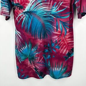 Tropical palm leaf print mini dress features a vibrant magenta and teal color palette with a deep V-neckline and elbow-length sleeves. Crafted from a stretchy polyester blend, this bodycon-style piece offers a flattering fit with a smooth, lightweight feel. The all-over botanical pattern makes it a perfect choice for vacation wear, summer parties, or a bold casual look.