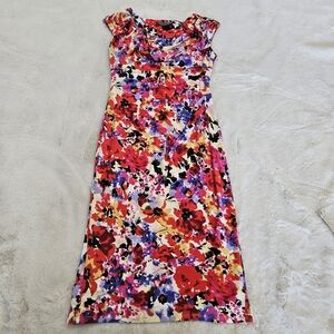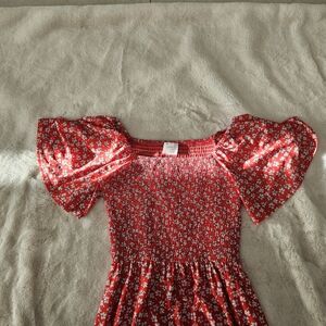 This is a lined dress with a stretchy textured bodice. Sizing says petite small but it is very long. Great for a daytime party, wedding or brinch!