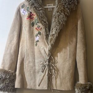 PTP 20” See pics for few Marks BUT CUTEST SUEDE FLORAL EMBROIDERED FUR, HOODED AND FUR CUFFED JACKET Chic tan teddy jacket with floral details. Features plush faux fur trim. Ideal for cozy elegance.