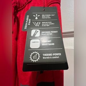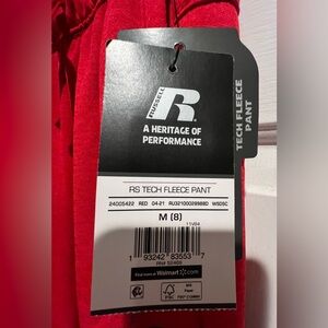 New Russell Tech Fleece pants in bright red. Size M(8). Has Dri-Power 360 tech to wick sweat away. Reflective details for when it's dark out. Zippered pocket for secure storage. Comfort waistband and Thermic-Power for warmth. Made with at least 55% recycled polyester.