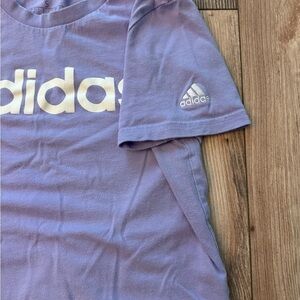Soft lavender Adidas tee featuring a bold white logo. Perfect for casual wear.