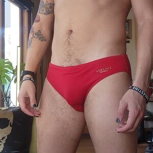 Double lined red swim briefs in recognizable barrocco floral print lining. Italian size 4, US Small/Medium.