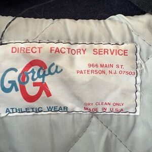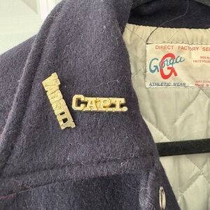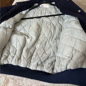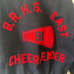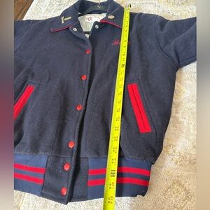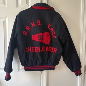 Vintage High School Varsity Cheerleader Bomber Jacket. Navy blue and red, embroidered name at front. Snap closure. Quilted liner. Good preowned condition. Measurements in Photos.