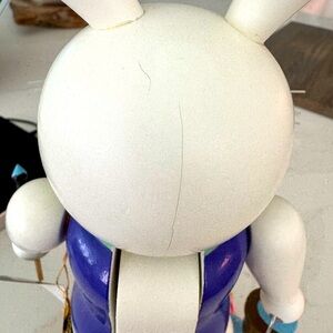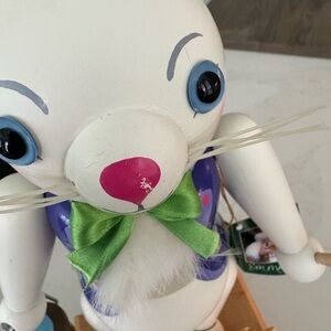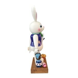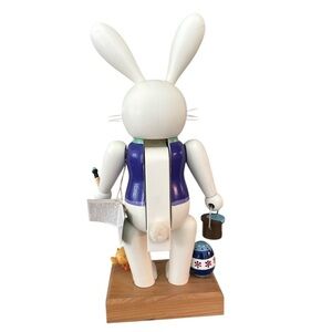 Em Merck Easter Bunny German Wood Multi Color Nutcracker Hangtag Vintage 1990 in very nice used condition. Has a little spot on his nose and on the back of his head and ears but in overall nice vintage condition. This cute little bunny 🐰 is ready for your Easter Spring table!! Made in Germany 🇩🇪 this guy is well made with colors of purple, blue, pink with a green bow tie and cotton tail. He’s ready to paint the town blue with his cute little chicken🐥 friend. Measures approximately 14" tall with a 5 1/2" x 3 3/3" base. Will ship with care 🐰