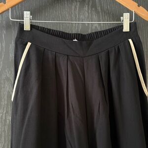 Elegant black wide leg pants. Features cream accents. Perfect for any occasion.