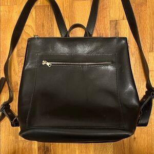 Sleek and stylish black leather men's backpack. Perfect for daily use and travel. Durable and versatile design.