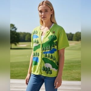 Vintage Classic Marisa Christina Green Golf Course Button Down Sweater Graphic