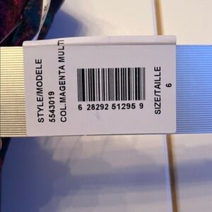 ABSTRACT JACQUARD SLEEVELESS WALK THRU JUMPSUIT WITH SWAN NECKLINE OVERLAY SKIRT AND STRETCH CREPE PANT