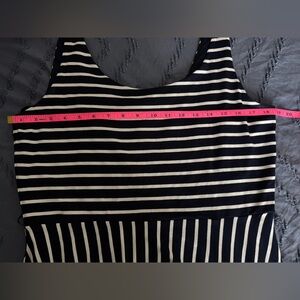 Chic and comfortable navy striped sleeveless dress perfect for any occasion. Features a flattering tie waist for a custom fit.