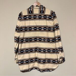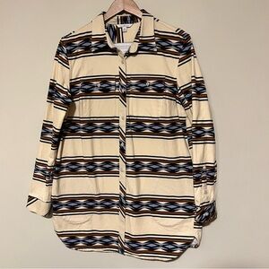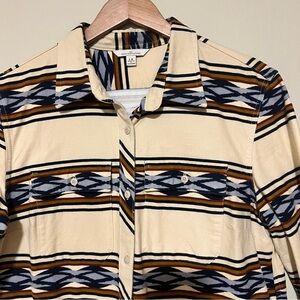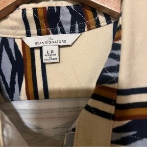 Stylish casual button down shirt by L.L. Bean. Features a cream base with blue and brown geometric patterns. Perfect for a relaxed look.