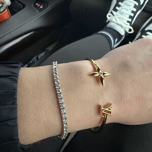 Chic gold bracelet by Louis Vuitton. Features a subtle pink detail. Adds luxury to any look.