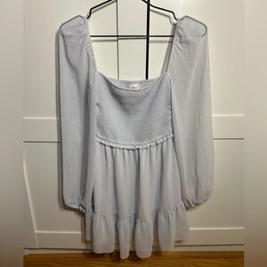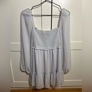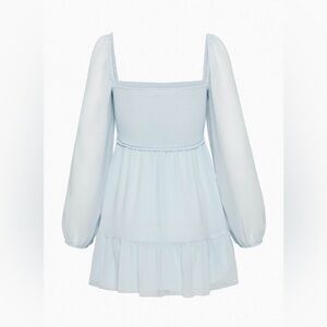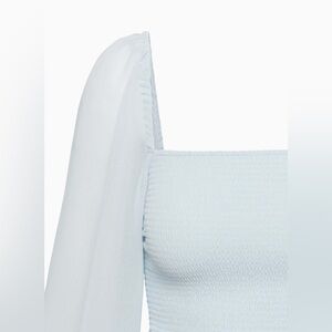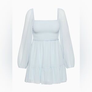 This is a tiered mini dress with a smocked bodice, square neckline and voluminous sleeves. It’s made with Fête Chiffon™ — lightweight, semi-sheer fabric with an ethereal drape
