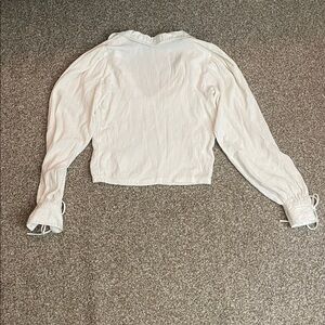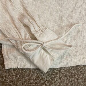 Elegant Free People White V-Neck Long Sleeve Blouse with button accents. Long sleeves feature tie cuffs. Ideal for any occasion. Excellent used condition, Armpit to armpit is approximately 17.5” and length is approximately 19.75”
