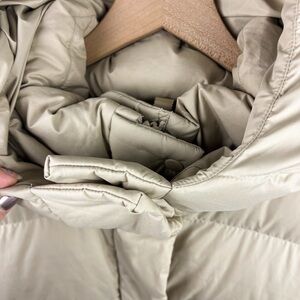 Long cream puffer coat. Hooded design. Full-length zipper. Warm and stylish.