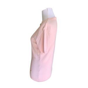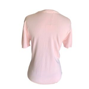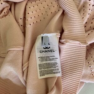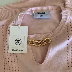 ‼️👉Elegant Chanel Style knit top in a soft blush pink shade. Features a flattering fitted silhouette with perforated knit panels running vertically along the front and sides. Designed with a round neckline and a subtle keyhole cutout at the chest, accented by a gold-tone chain detail for a signature Chanel touch. Short sleeves and ribbed trim at the neckline. A timeless, feminine piece perfect for both casual and dressy styling. Size L. Brand new with the tags 🏷️ on. Please note 📝 that this item was a sample and it was used for a variety purposes in Europe✔️item was provided by the advertising agency ✔️Sales are final⛔️No return after purchase⛔️No guarantee of authenticity, due to poshmark fees low offers are not acceptable. Please check all details before deciding to purchase✔️ Thank you 🙏