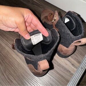 Stylish Sorel boots with black and brown design. Ideal for winter wear. Durable and comfortable.