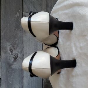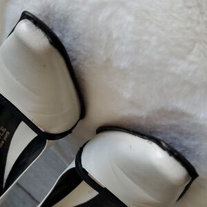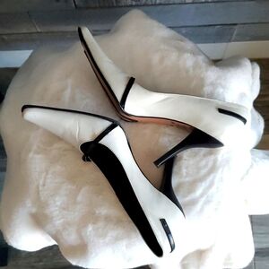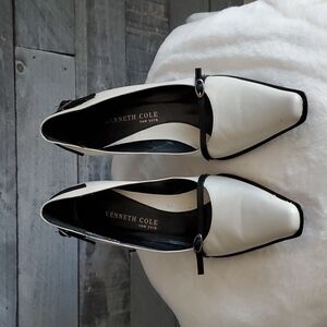 Absolutely gorgeous on fleek Kenneth Cole New York high ivory heels, these are off white with black trim excellent condition, couple itty bitty tiny unnoticable nics which can easily be polished in if a bother this is for the sassy classy chic who loves to dress sharp, or spunky retro with pionty square toe, size 6, leather