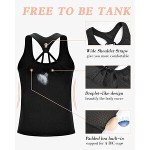 Features: Sleek sleeveless tank with a built-in, molded cup bra that offers support for B/C cups. The cool criss-cross racerback straps and droplet-like back design add a touch of style while ensuring support and freedom of movement. Made from stretchy, moisture-wicking fabric that keeps you dry, this tank is perfect for yoga, gym, running, or everyday wear.