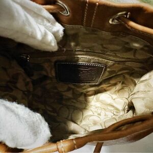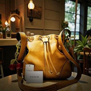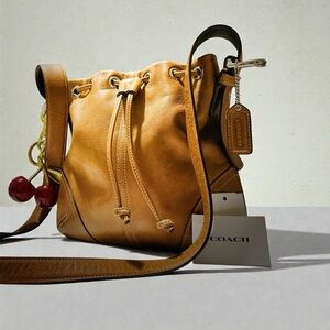 Valentine's Day on sale low price deal , make offer ,Vintage Coach soho shoulder Bag Tan Leather Drawstring Bag , vintage Coach 2003 years , for vintage still good condition, normal used , inside clean , other people sale $358-$500, I only sale $228, you can make offer , buy this vintage Coach bag will give you one brand new cherry keychain for free , very good deal , perfect gifts or yourself , Stylish Coach crossbody bag in rich brown leather. Features a drawstring closure and adjustable strap. Perfect for everyday use.