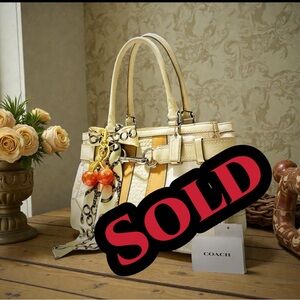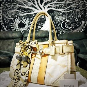 Vintage Coach soho shoulder bag Cream and Tan Women's tote Bag , vintage Coach 2008 years , other people sale$359-$500, I only sale $189, normal used , make offer , buy this Coach bag will give you brand new dusty bag for free , and scarf for free , will give you brand new cherry keychain for free , pick one color , message me, let me know which color keychain you want , only small issue have a little wear , but scarf cover , can’t tell , she is so beautiful and so cute , she has really go to your house, Chic Coach shoulder bag in cream and yellow. Features elegant design and high-quality materials.
