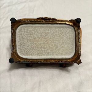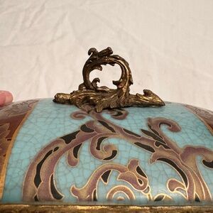 Beautiful vintage porcelain jewelry box featuring a soft turquoise crackle-glaze finish accented by ornate gold-tone filigree, decorative feet, and an elegant lift handle.