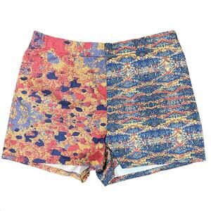 Fun and bold Azsalyn colorblock print shorts featuring two contrasting patterns for a standout summer look. Designed with a clean front and a hidden side zipper closure for a flattering, tailored fit. Comfortable stretch cotton fabric makes them easy to wear for warm weather, travel, and casual days.
