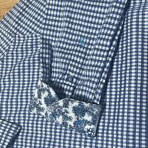 The product is a men's dress shirt by Robert Graham in size L. It features a blue floral pattern with a flip cuff detail, making it a stylish and sophisticated choice for any occasion. The long sleeves and button-up style add to the classic look of the shirt, perfect for those who appreciate a touch of flower-themed design in their wardrobe.