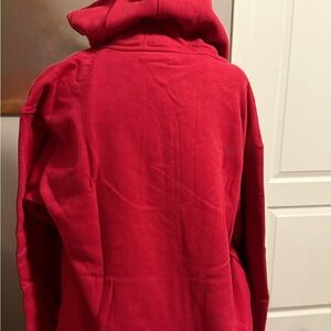 New with tags Calvin Klein zip-up hoodie in a bold red color. Features a full front zipper, adjustable hood, front pockets, and signature Calvin Klein logo tape down both sleeves. Soft, comfortable fleece feel with a clean, structured fit.