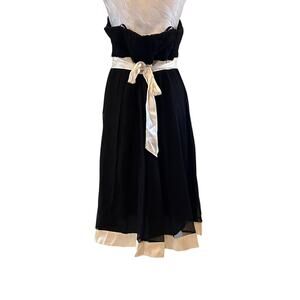 Y2K Maggy London silk chiffon halter dress with cream satin crisscross bodice, pleated black skirt, and bow‑tie back. Elegant, feminine, and perfect for cocktail events, weddings, and formal occasions. New with tags.