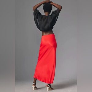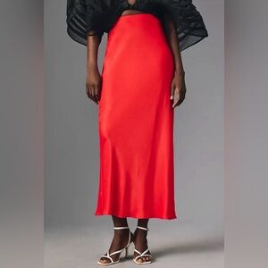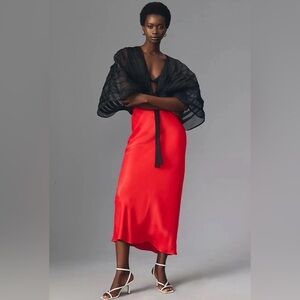 Red Tilda skirt. Lightweight, stretchy, skims curves. Elastic waist. Flattering, festive. Dress up or down.