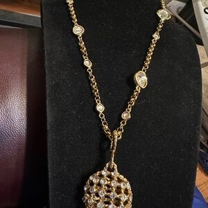 Elevate your style with the Blanca Gold Pendant Necklace, a stunning piece that captures the essence of elegance. This necklace features a 36-inch adjustable gold-tone chain, adorned with a clear crystal ball pendant that sparkles with every movement. Perfect for special occasions, this necklace adds a touch of sophistication to any ensemble, whether it's a gala, wedding, or an evening out. The lobster closure ensures a secure fit, making it a reliable choice for your jewelry collection. Pre-owned and in excellent condition.