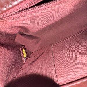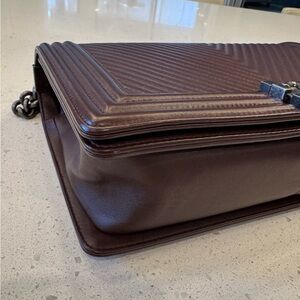 Authenticated Chanel Boy bag in a brown lambskin leather with chevron quilting and antique silver-tone hardware.