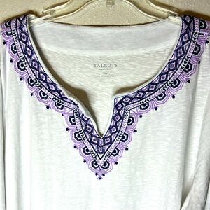 TALBOTS Plus Petite Top T Shirt Tunic Cotton Embroidered Geometric Neckline front and back