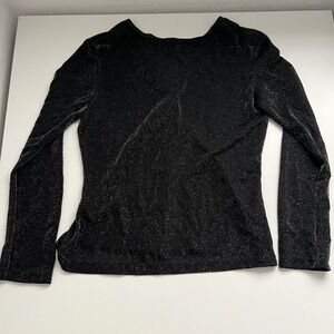 Elegant, black button-up top, a sophisticated addition to any wardrobe. It has long sleeves and a v-neck. The subtle metallic sparkle catches the light beautifully. Style this top for a dressed-up dinner or a festive holiday party.