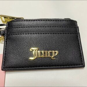 Comes with gold heart keychain. Has 2 card slots on each side, so 4 in total. There’s gold writing on the front and back of card holder and gold zipper with juicy couture engraved in them. The interior is black and white and has gothic writing.