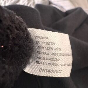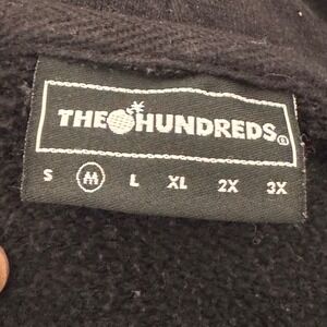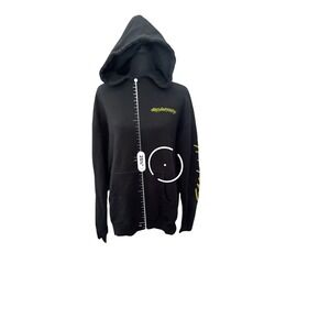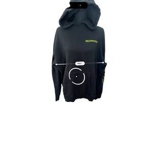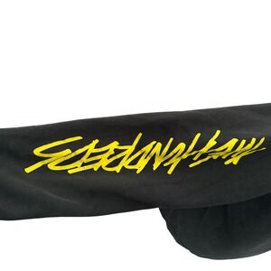 Black pullover hoodie by The Hundreds with eye-catching yellow graffiti style lettering on the sleeves and chest. Features a drawstring hood, a kangaroo pocket, and a yellow bomb logo on the back. This sweatshirt offers a comfortable and stylish look. Missing drawstring.