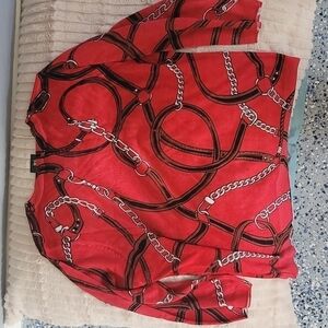 This red lightweight sweater top is a gorgeous piece with just the right amount of bedazzling. Chains and horse bridle design with 3/4 sleeves.