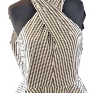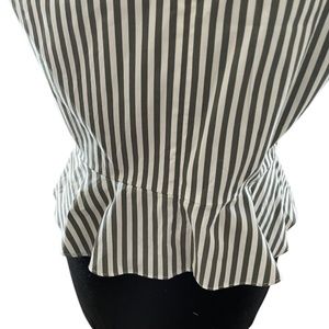 This sleeveless blouse features a striking white and army green striped pattern,